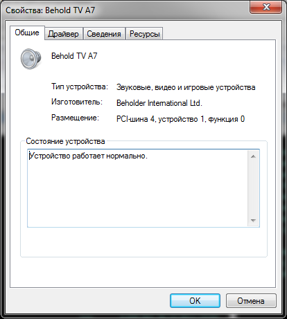 Точно такая-же проблема, тюнер behold A7, win7 x86. Всё работало нормально (много лет  ), обновил драйвер на последний - 5520, ПО тоже на последнее - 5.28, какое-то время работало, потом начало выдавать "Не обнаружено ни одного устройства Beholder. Установите устройство и BDA драйвер Beholder" В диспетчере устройств драйвер стоит и прекрасно работает Вложение: