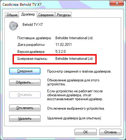 abonado писал(а): Вот что у меня показывает система... Как видно, подписи нет! Всё нормаль там, у меня так-же. В списке файлов драйверов только 4 подписи и те от Microsoft. Но выше, на самой вкладке "драйвер" указано что есть цифровая подпись "Beholder International Ltd.". Я так понимаю что подписывается не сами файлы а cat или inf для инсталляции. samfednik писал(а): А что, при вкл. компа нажимать F8 и отключить проверку цифровых подписей не прокатывает? Зачем ? У меня например на лицензионной Win7x64 проблем с бехолдером нет, драйвер нормально работает, подписи я не отключал.