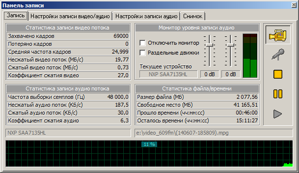 germes писал(а): выбрал "Software MPEG (Intervideo)",заменил папку на С:/video/ и ничего непроисходит,а звук записывает. А статистика меняется? Как у меня на скрине. Скрин с 609FM, Intervideo MPEG2. Win7 Pro x64. germes писал(а): ещё смущает так это"текущее устройство (рис 2)раньше оно у меня другое было,где его поменять или посмотреть можно?может изза него все проблемы. Всё равно. Этот NXP - чипсет тюнера. Проще говоря - звук идёт по шине. Это наилучший вариант. Если Вам не нравится - снимите галку - 2-е вложение. Но при этом Вы должны установить драйвер на звуковуху (виндозная хрень по умолчанию не годится) и настроить BhConfig.